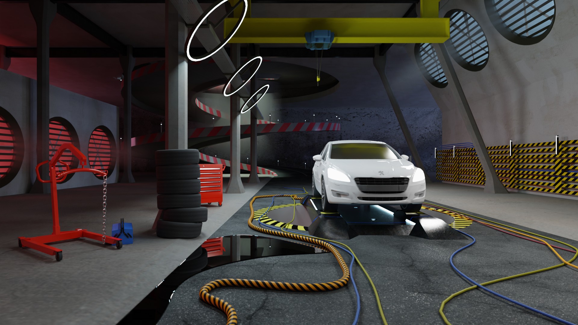 En primer lugar he desarrollado el concepto artístico que quería plasmar en la prueba. Un estilo urbano en un escenario elegido por su primer plano para la presentación del modelo de vehículo y un fondo que hablara de un entorno urbano soterrado más grande, un parking abandonado. Un espacio de interés abierto, dentro de un entorno de una escala más urbana. Además, he incorporado formas curvas y desarrollos no ortogonales junto con geometrías más simples para mostrar mis capacidades en mallas de cierta complejidad a la hora de modelar, mapear tiles y optimizar en modelos no lineales.